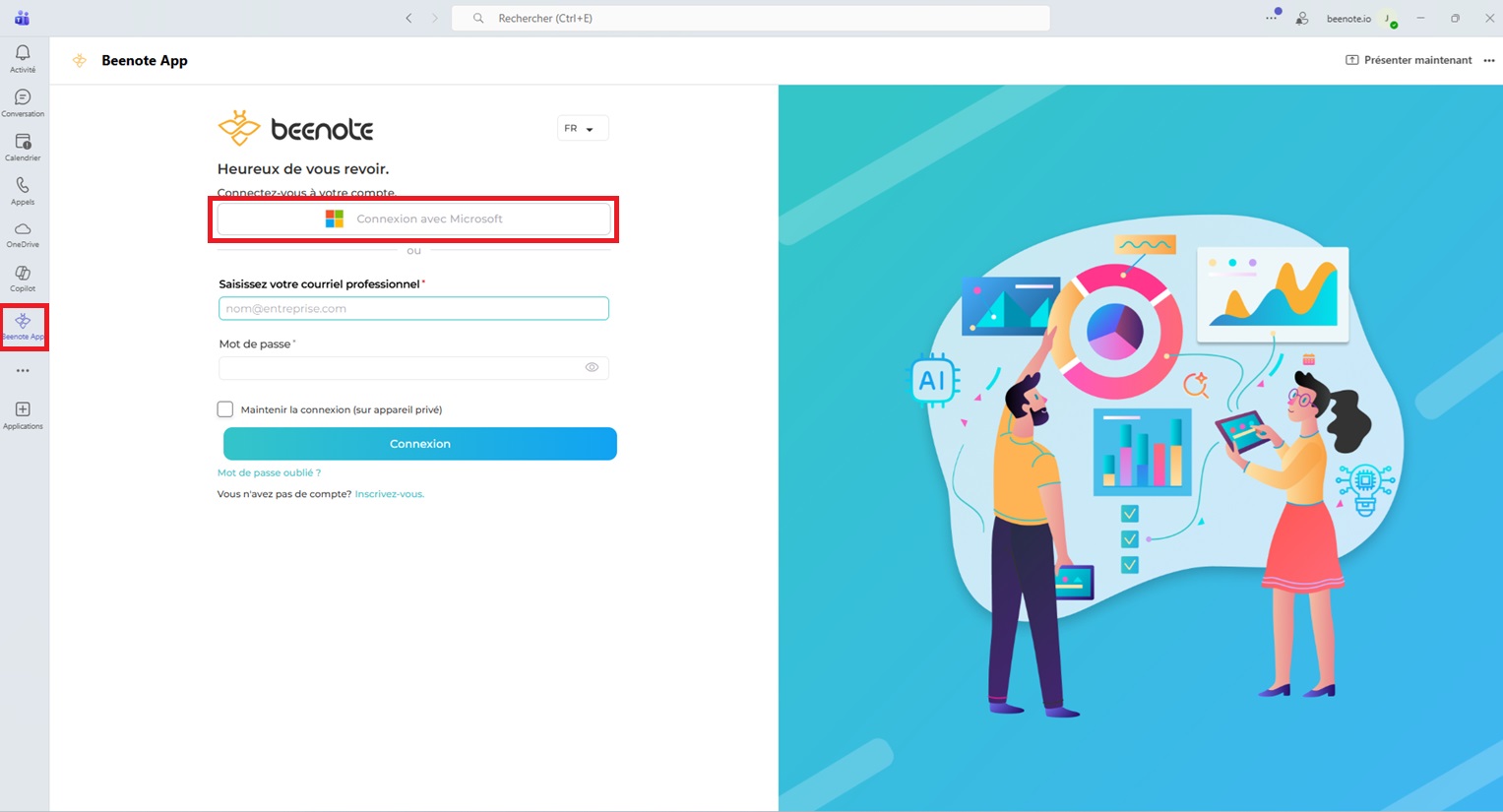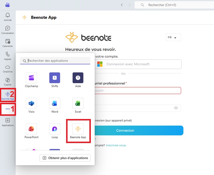 Vous ne pourrez pas utiliser Beenote à partir de Microsoft Teams, sauf si vous en faites la demande auprès de la personne qualifiée de votre entreprise.
