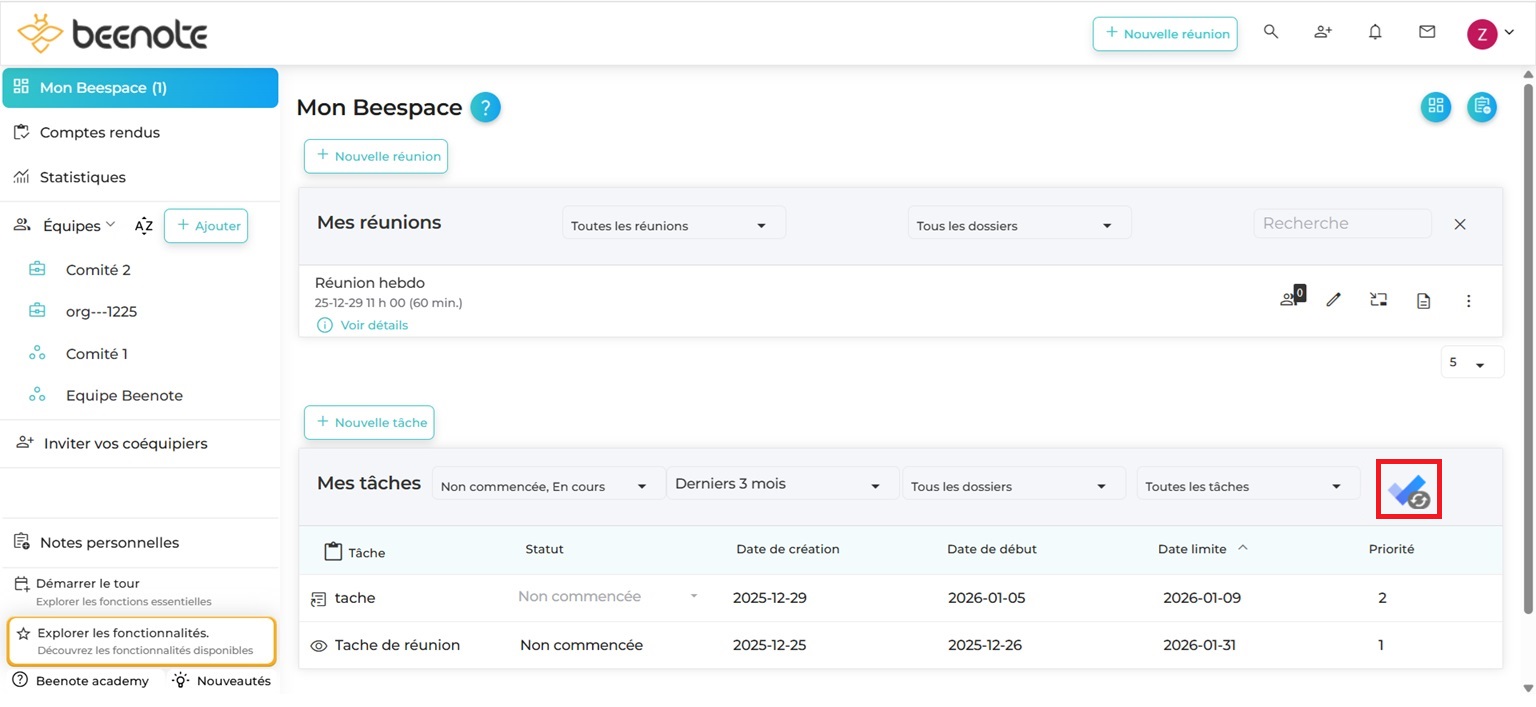 Dans votre section Mes Tâches de votre Beespace, le bouton